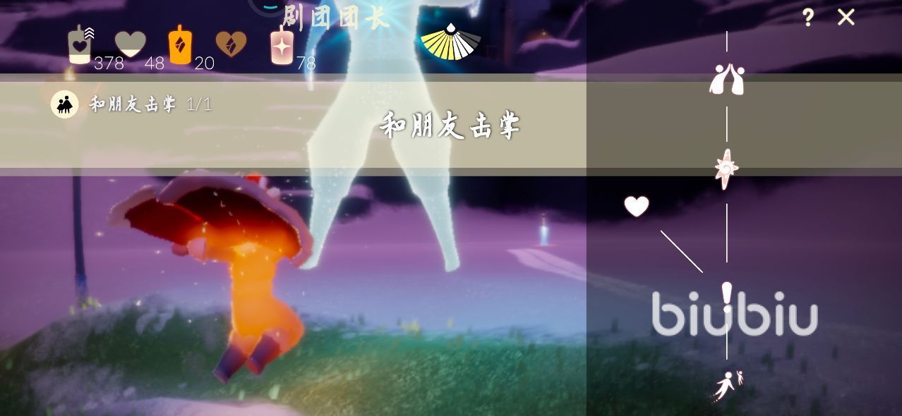另一个需要做的事件就是与他人击掌,这里要有他人的配合,如果好友都不在线的话,可以尝试去雨林或霞谷寻找在那里的常驻先祖,这里有两位是可以进行互动的,在此处就能完成这项任务。
