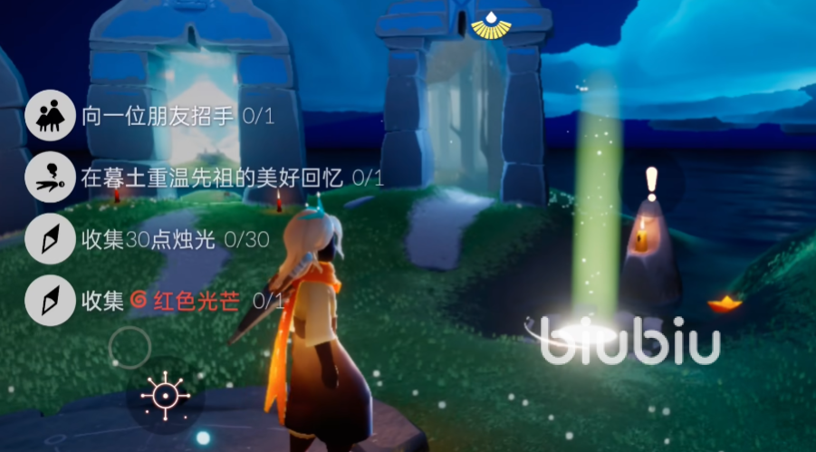 今日需要去往指定地点的事件是重温先祖,而它的位置在进入暮土后,下去旋涡然后往左前方第一个柱子后面飞去,那里就有一位先祖,看到它之后就可以走进点亮,这样就能再次重温一次它的回忆的了。