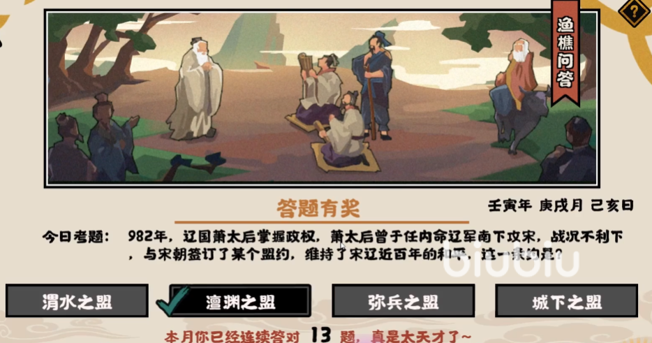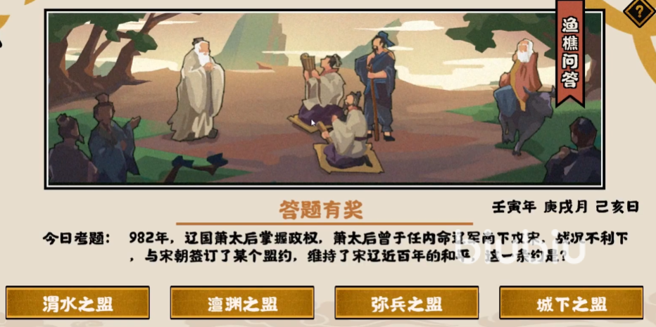 这期给出的问题是在九八二年的时候,辽国是由一位太后掌控了当时的大权,那时的她还命令自家的军队往南进攻,势必要将宋国攻打下来,不过最终的战况并不理想,然后就与宋国签订了一个盟约以此维护了两国的百年和平,请问这项盟约是什么。这里正确的答案便是澶渊之盟。