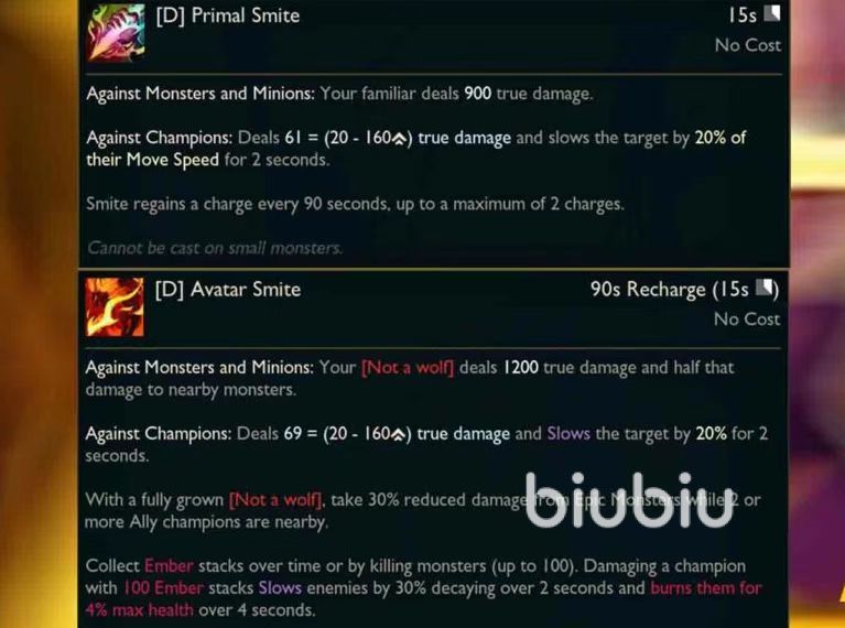 现阶段的惩戒初始只能惩戒野怪,伤害为450,使用五次后可升级为对野怪900真伤的惩戒。而在13赛季惩戒可由最初形态变为野性惩戒和重击的灵兽惩戒,野性惩戒的效果和现阶段的终极惩戒差不多,但作用在英雄身上效果则是红蓝惩戒的结合。