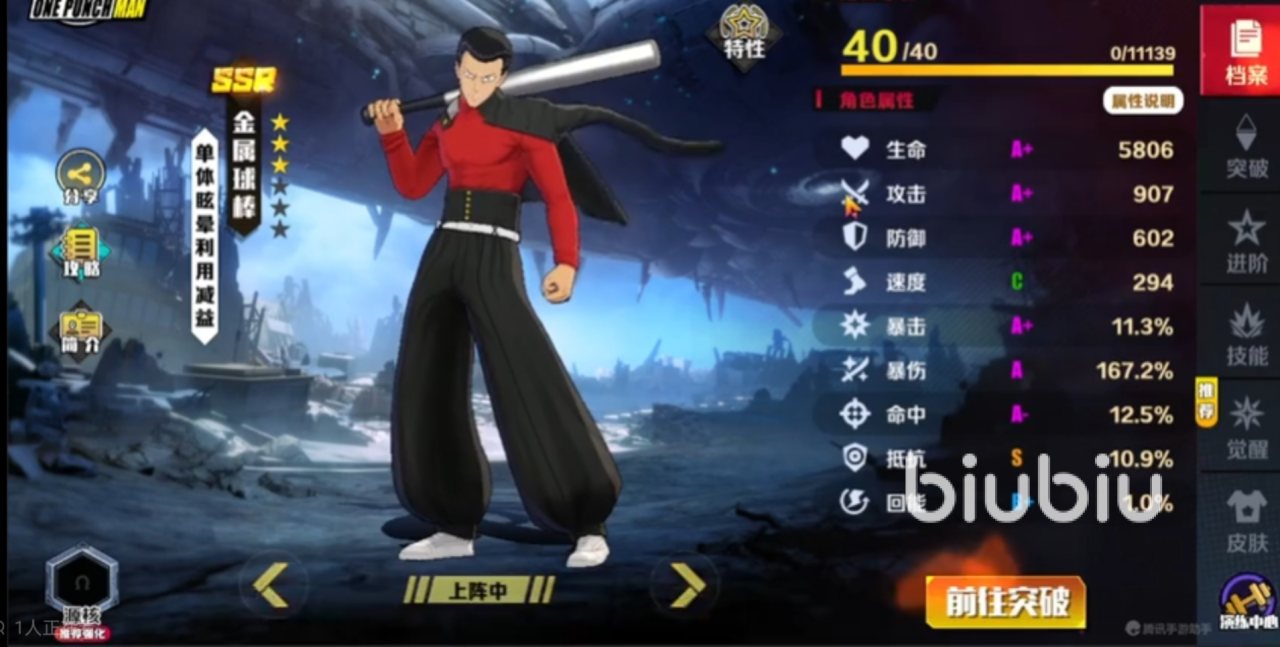 金属球棒是一个需要配合debuff的英雄,金属球棒的伤害多来自于敌人身上debuff的数量,敌人身上的负面状态越多,金属球棒的伤害增加值就越大,金属球棒的绝技也有一定的概率眩晕敌人,可以说金属球棒集单体爆发,控制,群伤于一身,是一个综合性能非常出色的英雄。