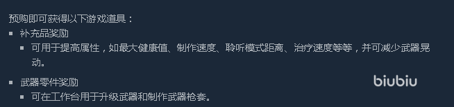 当然了如果只要数字版的话可以在本月底前进行预购,可以获得补充品和武器零件方面的奖励也就是这些东西了,总的来说不算很丰富,即便没有提前买在剧情推进后也能解锁。