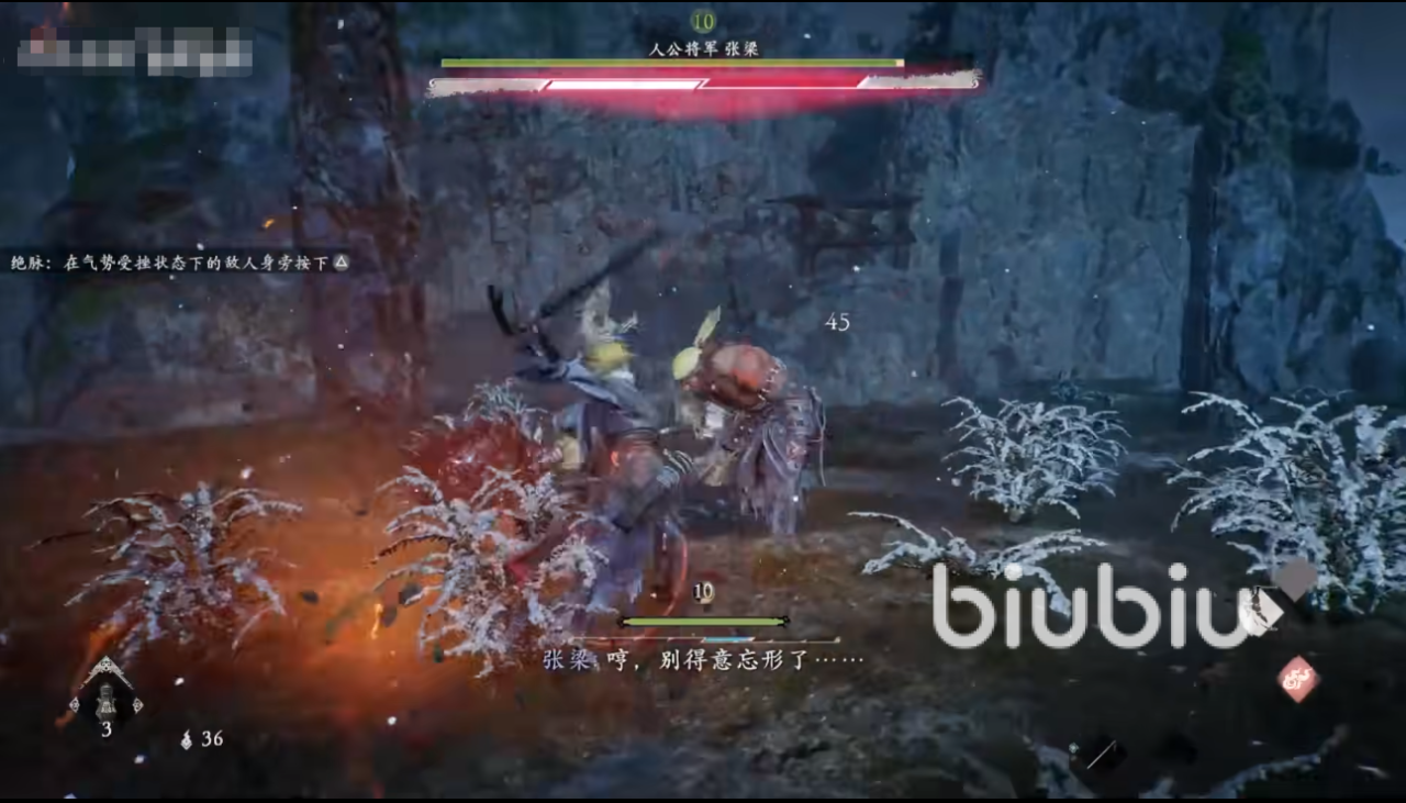 首先来说下张梁非魔化状态还是个比较英雄霸气的模样,这时候他也没那么强,我们玩家只要使用好技能,连续攻击他,那么他就会触发一直格挡的状态,基本上没什么时间对我们造成伤害,那这样打败他就非常容易,只要发现他进入绝脉,在这个状态下不要着急使用处决,玩家是要看自己的气势够不够,不足的话处决伤害不够高的,可以多打一会普攻攒好气势再处决,这样打出来超高伤害轻松KO他。