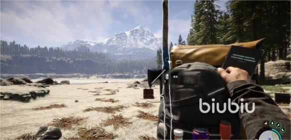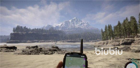 然后就是建立据点的地点了,几个人一起,我落在了一座雪山上,从山上往下看,首先映入眼帘的是一片 U型沙滩,有山有水,非常的开阔,非常的适合建立据点,沿着小溪向上,可以看到小地图上有一个蓝色的标记,上面有一辆被遗弃的吉普,距离山洞一米左右,可以找到一台笔记本电脑,用3D打印出一瓶矿泉水,还有一些其他的东西,有了这些东西,就不用担心水的问题了。