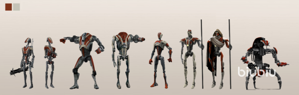 这么快就到第7,8个了,这两个其实也是一个类型的,一个带帽子,一个没有,他们的外观参考原著,应该是将军的保镖,属于保卫机器人,善于近战,战斗表现跟绝地武士不相上下。