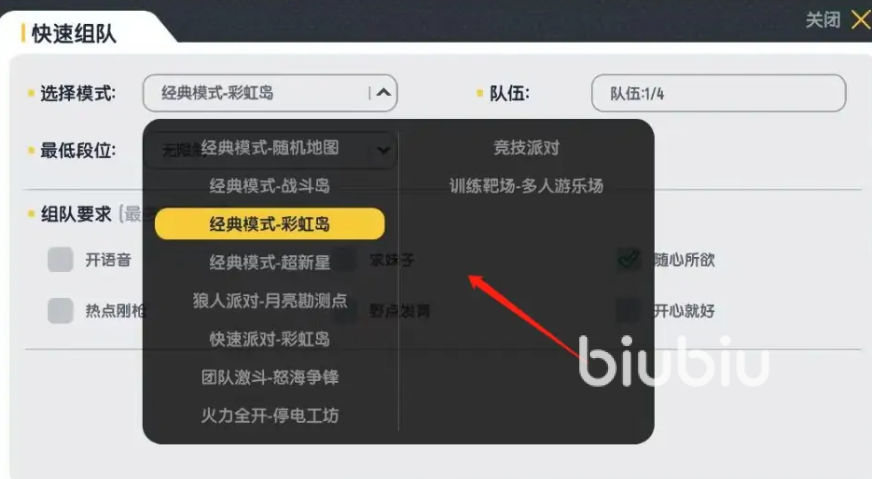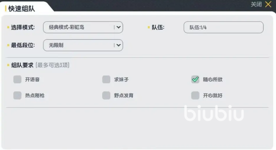 第二个是快速组队,这个基本上是和路人进行匹配,玩家可有点击之后选择自己的偏向和要求,包括筛选地图以及段位限制等。当然了你同样可以全部点无限制,那么一切就会变成随机的,包括你的队友以及进入的地图都没有办法预测,如果你不是老手的话还是稍微选择几项。