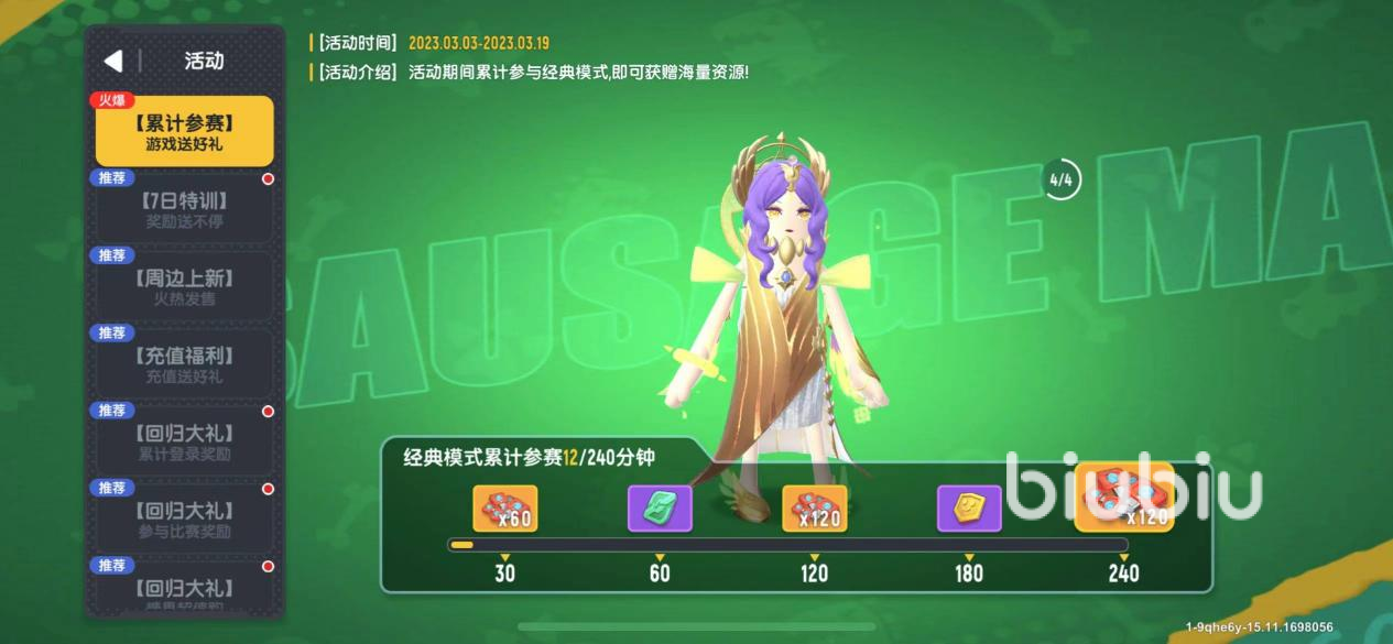 首先是最轻松的累计参赛任务,这个需要玩家们去参加经典模式玩法,每达到一个时间就会有多种好礼赠送。分别到30分钟,120分钟,240分钟可以有补给箱钥匙,可以抽取道具皮肤,60分钟可以获得功能道具友友卡,获得季票的功能加成,到达180分钟更是可以获得免掉落段位道具。活动时间3.3号到3.19号,完成时间绰绰有余。