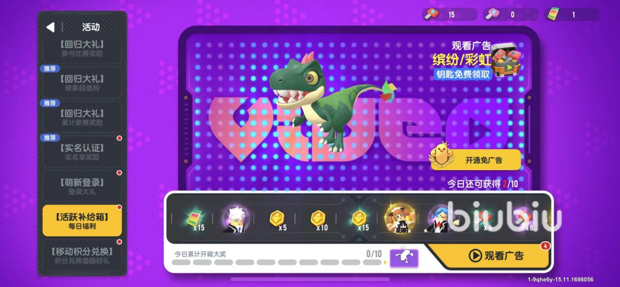 接下来说下最常规的活跃度任务,玩家只要保证每日开箱,就可以获得动作,如果愿意点击广告看一会,那么还可以免费领取各种类型箱子的钥匙,可以开出来各种珍惜道具,滑板套装,校园少年套装等等。