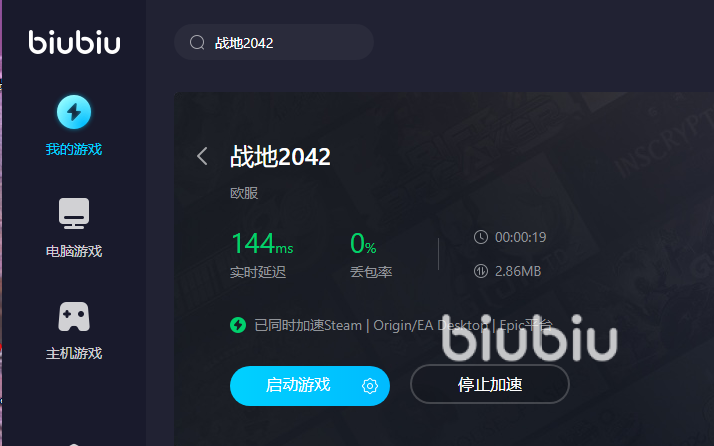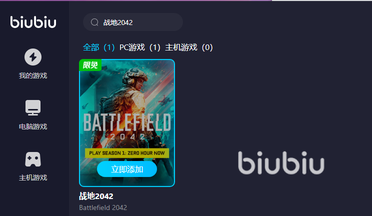 2.安装完成后可以选择自动打开加速器,这时候就能看到游戏大厅界面了,点击搜索栏查找到我们想玩的战地2042,并且游戏目前还可以参加biubiu加速器的限免活动,时间会一直持续到2023年3月24日,十分划算。