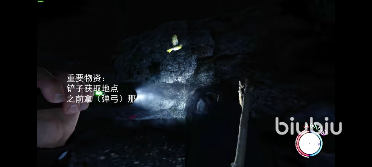铲子出生的位置与之前拿弓箭的位置大抵相同,就在玩家坠机后出生的海边右上角。可以通过GPS上的定位发现右上角有一个黄色的圆点,周围有扩散的白圈,这就是刷新弹弓的位置了。