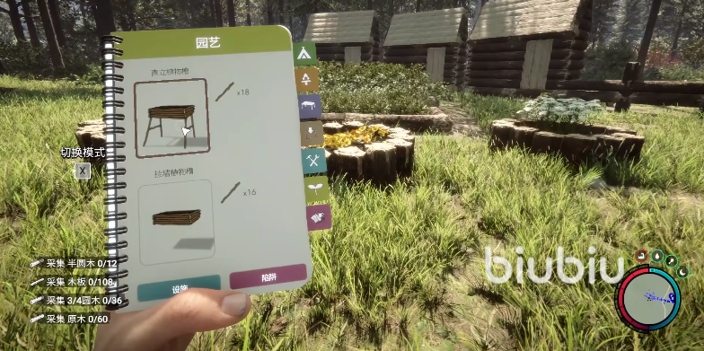 其实很简单打开园艺菜单,然后你就可以看到书页上有两个选项,分别为直立植物槽和挂墙植物槽,选择你喜欢的一个然后把他摆在地上,你可以看见上面有个树叶的标记。你可以在里面种植相应的种子,种子在平常采集东西的话就能自动获得,这一点设计还是很方便。