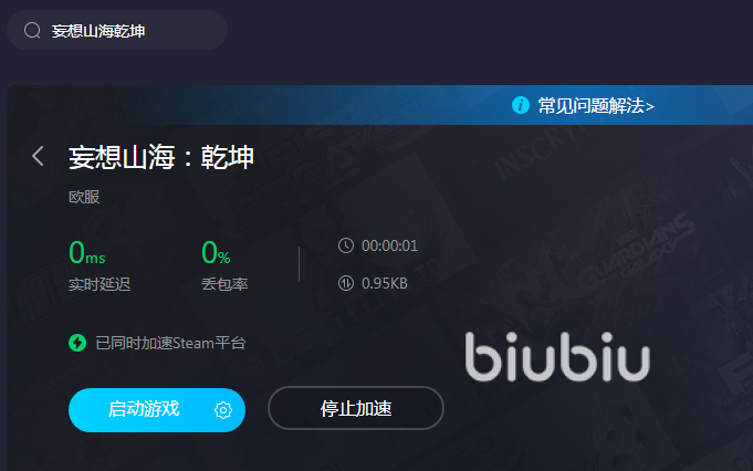 biubiu支持手游、端游、主机的游戏加速工作,玩家们可以随时开启加速,在biubiu内找到妄想山海乾坤,直接点击立即加速,只需要几秒钟的时候就可以轻松完成了,使用起来非常的方便。