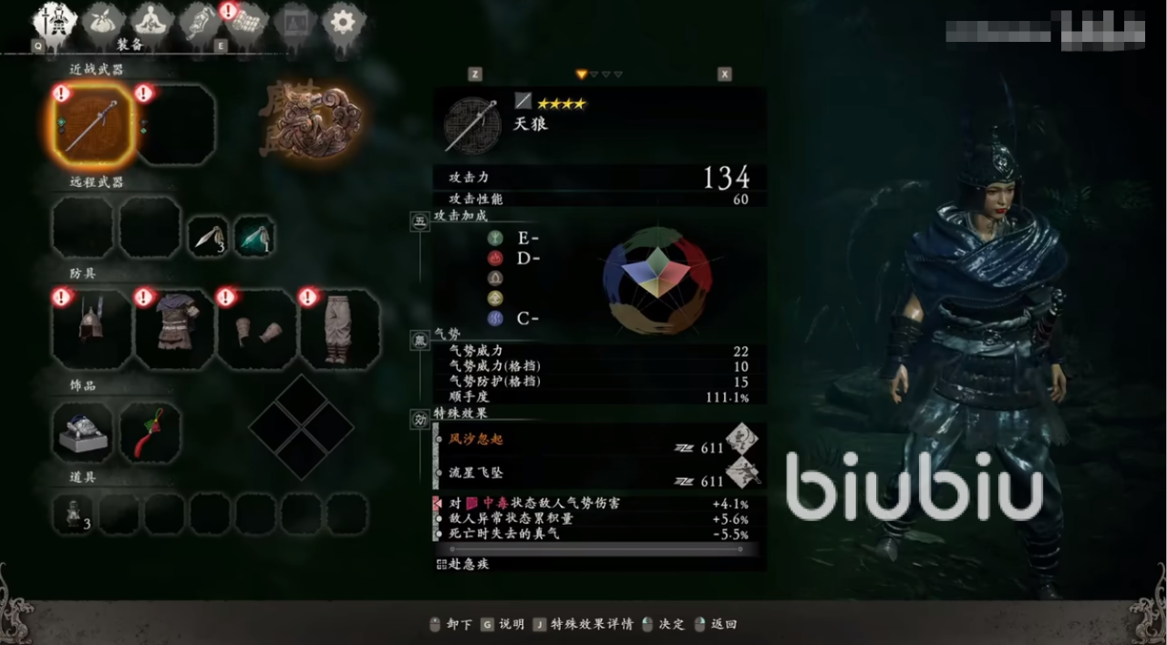 第一把就是天狼,它十分有特色,对于玩家操作节奏有一定要求,长按之后接上风沙忽起技能可以高速移动,不过方向是向前,当松手之后就可以放出斩击,气势值高的时候还会附带追加效果,大大提升威力,可以无视敌人的行动不会畏惧,只害怕敌人的强力攻击。