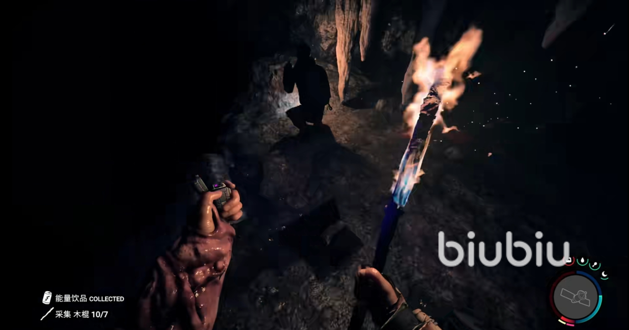 我们来到白色的洞穴门口,可以获取到弹弓等一些简单的物资。进入之前需要拥有氧气面罩的库存,才可以来到有铲子的地方。如果想获得电击枪的话,则需要进入里面的钟乳石区域进行查看。绿色的标记地点通常会出现打印机,我们可以将其制作变换成水壶,用来储存水源。