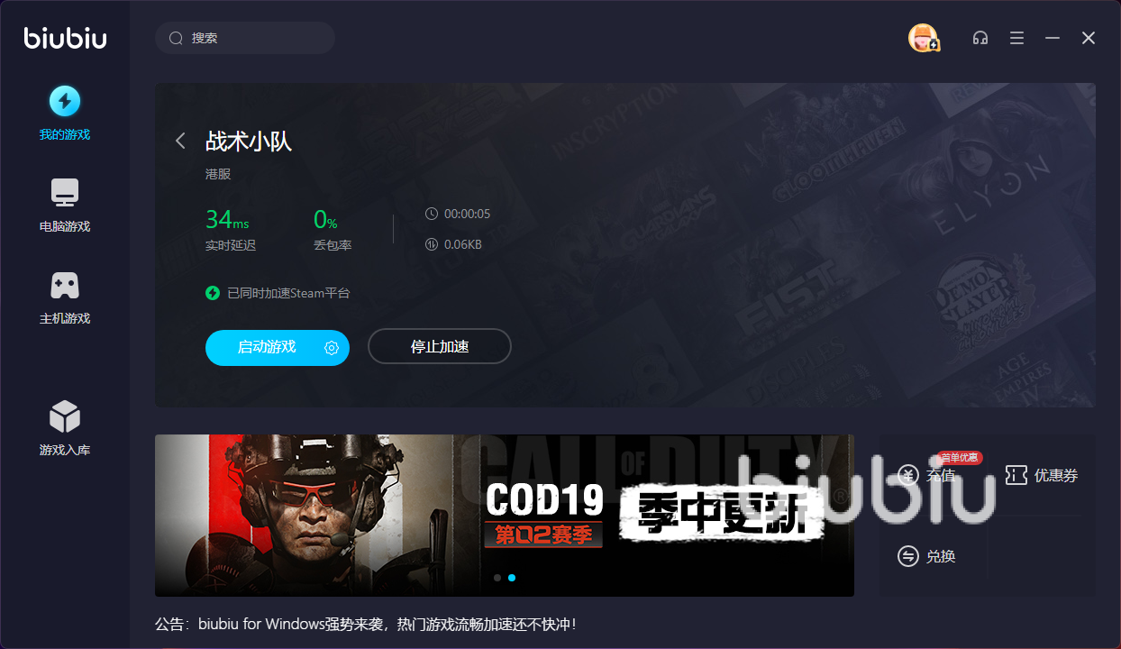 使用Biubiu加速器进行游戏加速也十分简单,在简单的注册了账号之后完成我们的实名制认证,再在左上角搜索我们想要加速的游戏——战术小队,想要加速的“战术小队”就会出现在我们的加速界面之上啦~