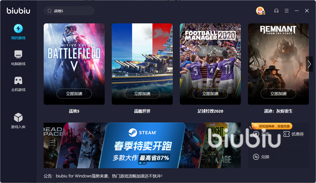 战地5最为一款支持多人在线的枪战游戏,它的剧情模式虽然很经典,但是多人pvp才是它最主要的玩法哦,相信有不少小伙伴们在战地5剧情模式中体验到了出色的战场光影设计和极度逼真的模型系统后已经迫不及待的想要在多人模式中体验最真实的战场对战吧,很可惜的是因为没有国服的关系,小伙伴们在多人模式中经常会出现掉出房间,移动丢包,与敌人对枪时因为延迟过高网络波动而悲剧性的被击杀等情况吧,小编在这里推荐的biubiu加速器可以完美的为大家解决这个问题哦!