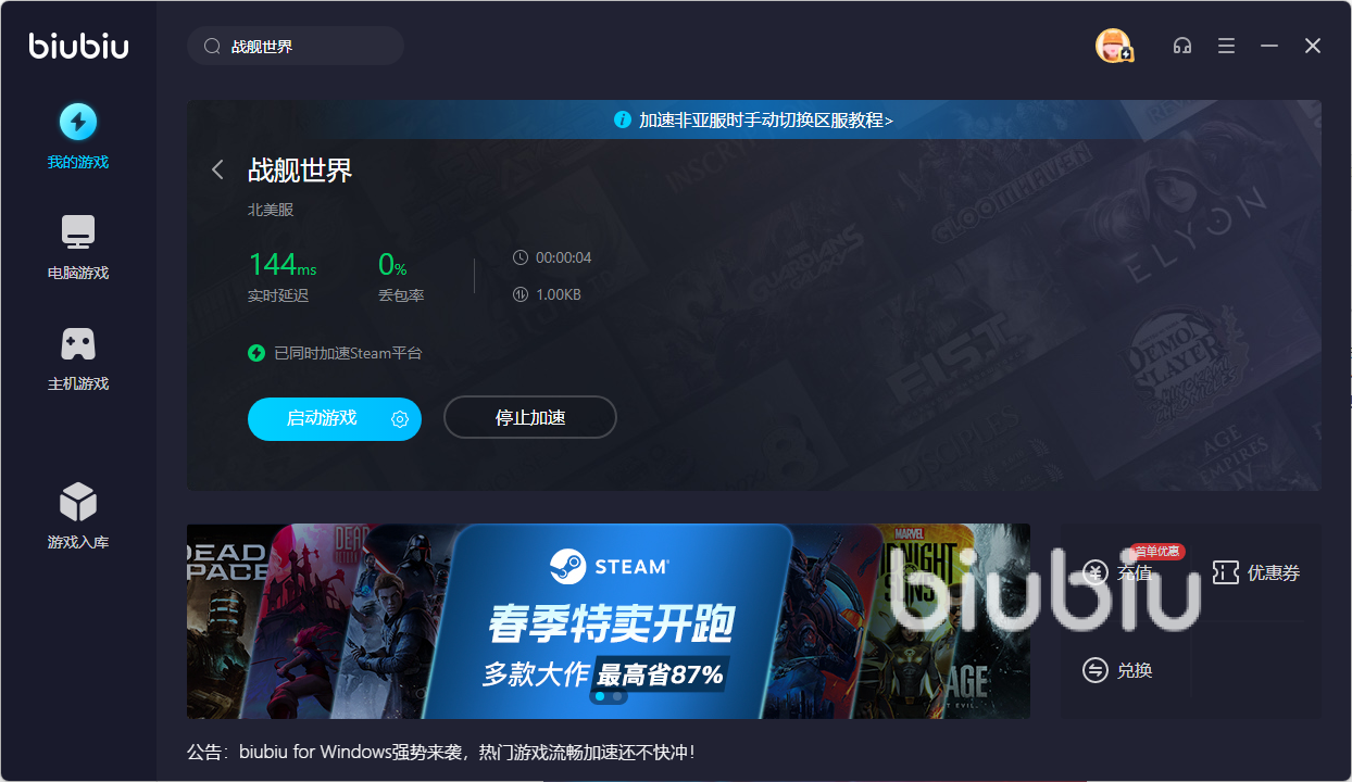新入坑的小伙伴们在不知情的情况下直接登陆战舰世界有没有发现,单人模式还好,但是多人模式下常常会出现加载慢,进房间后常常丢包,敌方舰船瞬移等问题,让人苦恼不已,小编在这里告诉各位新入坑的小伙伴,这一切都是因为延迟问题哦!因为高延迟而导致我们的舰炮常常落点不稳,错失击毁敌人舰船的机会,严重的可能会直接掉出房间,但是当我们使用biubiu加速器的话,一切困难都迎刃而解啦!下面由小编来为大家介绍一下biubiu加速器的优点以及使用方法吧!