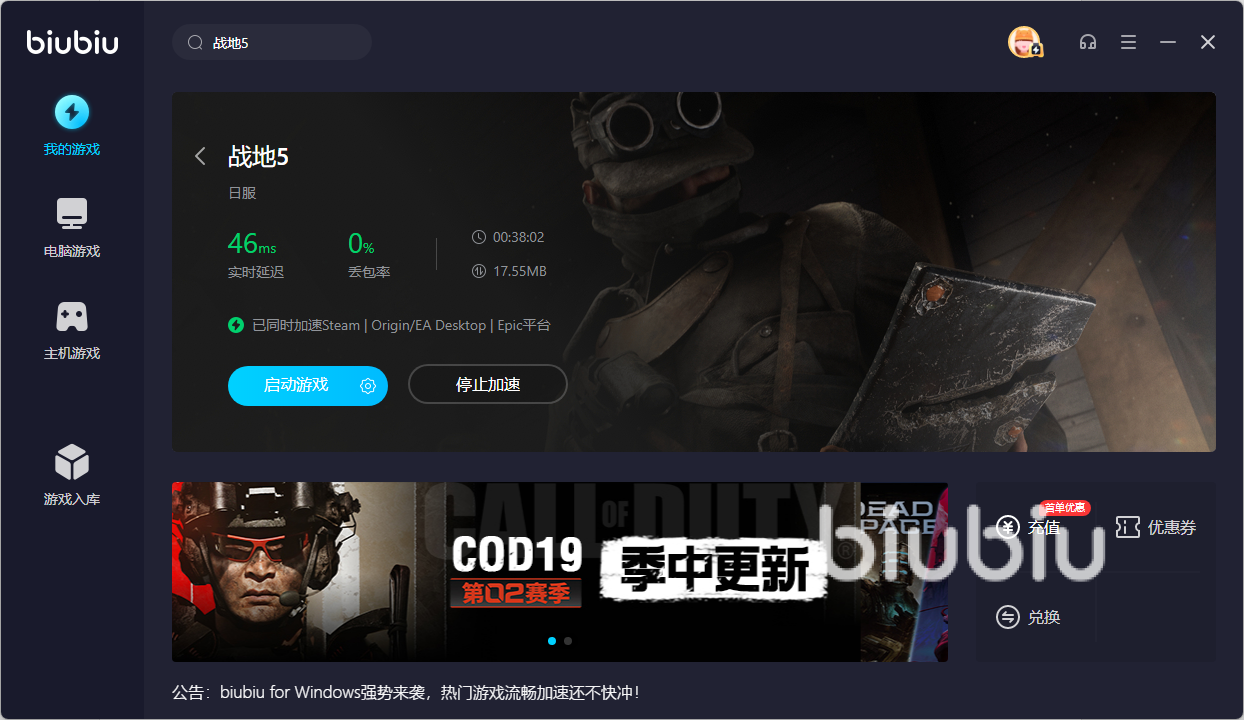 2023年03月27日 19:34 来源:吞噬再大针蜂战地5作为战争游戏史上最成功的枪战游戏,枪战游戏中最成功的战争游戏,一直在游戏玩家们心中占据着很重要的位置,但是因为没有国服的关系,所以玩家们在游玩战地5的时候经常会卡的不行,战地5加速器选哪个比较好呢?小编作为一名资深的战地5玩家,在体验了各种加速器后,经过对比,还是biubiu加速器更为稳定高效。