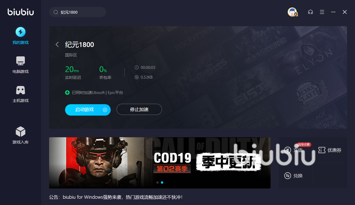 如果小伙伴们下载了biubiu加速器之后,新用户首次注册的话,只需要完成实名认证就能够获得免费的3天全平台会员,就能够畅享包括纪元1800在内的数百种游戏加速,每一种加速都支持智能双线模式,这也是为什么使用biubiu加速器加速纪元1800这款游戏比其他平台更稳定的原因所在。