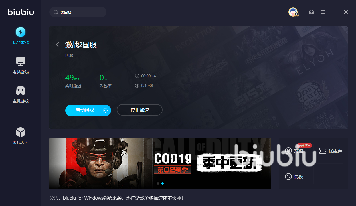 有小伙伴担心biubiu加速器出色的功能背后是高昂的收费价格,其实这一点完全不用担心,如果是第一次下载体验biubiu加速器的小伙伴们,只要完成了实名认证之后就会获得3天的全平台会员,有充分的时间让小伙伴们先体验这款加速器的效果之后再选择是否续费,更何况在biubiu加速器内首次充值还有优惠,一切都是为了小伙伴们更流畅的游戏体验着想。小伙伴们下载biubiu加速器之后只需要在左上角搜索激战2,就能够进行加速啦!