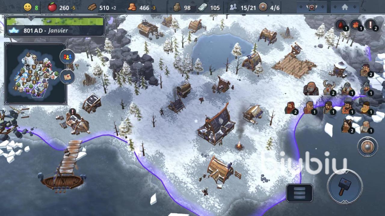 在游戏中可建造建筑数量比较多,而且有非常明确分工,每项都有很重要作用。例如要想增加人口上限,必须多建造住房,想要有矿工去采矿,矿厂培训必不可少,还有生产侦查兵的兵营,生产出来的侦察兵可以探索更多地块。还有交易站,伐木场和防御塔等建筑。这些建筑在模型方面建造非常细致,就像是真正在村庄中体验北欧风情一般。资源生产还会随着季节进行改变,在冬天的时候粮食产量降低,还需要消耗各种木材来取暖,如果木材消耗殆尽,村民会面临很严重的生存威胁,这些都是要解决的问题。