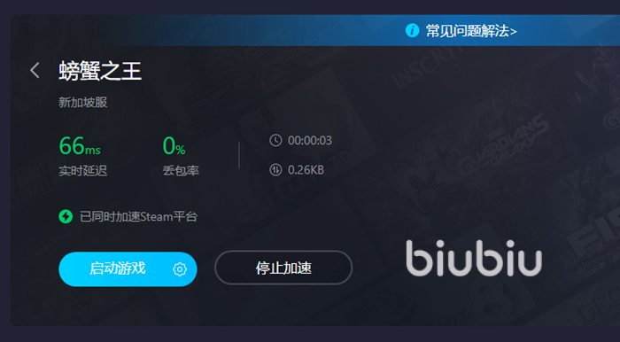 大家会发现,使用biubiu能够一键完成加速的开启操作,对于螃蟹之王这样带有多种区服版本的游戏来说,只要选择自己正在游玩的区服就可以了,而且第一次选择完之后,后续不需要重复操作。这款软件的加速效果还是相当不错的,而且十分稳定,这得益于多个节点的专线传输技术,还能够在游玩的过程中进行多线路的智能切换,省时又省心!如果大家在游玩的时候遇到了一些网络故障问题,加速器内也非常贴心地为大家整理了常见问题的解决方法,非常给力哦!