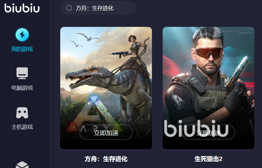 大家打开biubiu加速器平台以后,通过上方的搜索栏内找到方舟生存进化,添加到我的游戏内,然后就可以进行加速了,这样的一部操作主要是了下次玩家们使用方便,进行归纳整理的作用。在biubiu加速器平台里内容就很简洁,主要就是为了大家的游戏加速去服务的,作为一个用户,还是觉得非常得棒。延迟低,丢包情况也基本不会发生,安全稳定,是游戏玩家们的不二之选。建议大家尝试着用一下,好用的话再推荐给身边伙伴哦。