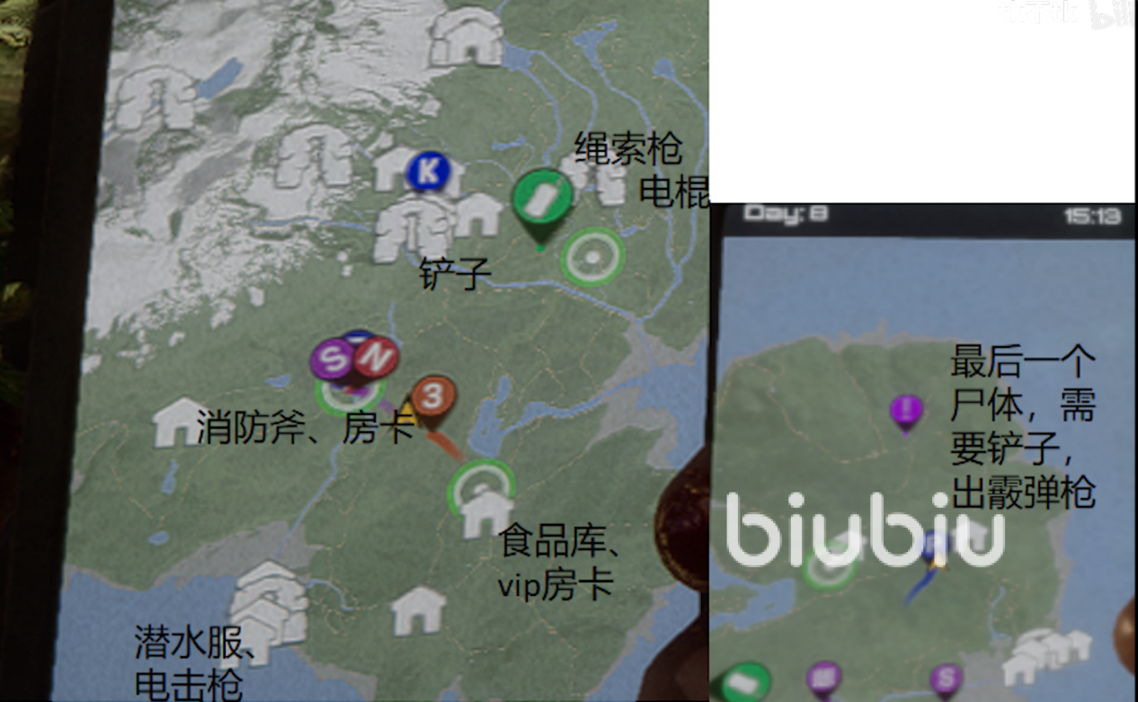 游戏中一共有三个尸体处:一个在悬崖上砍断绳子可以获得一个手电筒,一个在大海皮艇上,搜索尸体会发现一把手枪,一个在十字架下获得霰弹枪,这些都是必不可少的装备哦。之后可以选择去地图中部探索,找找洞穴可以获得消防斧和房卡,还有食品库和vip房卡以及一些衣物和食物。