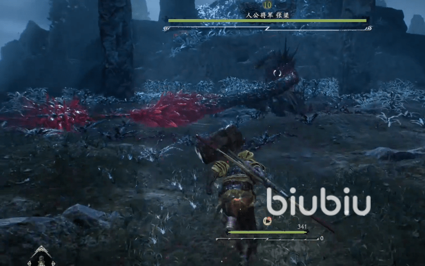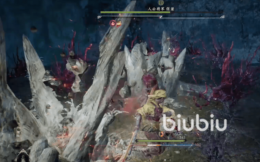 接下来我们再来讲一讲具体的操作细节。第二阶段的张梁会进入魔化状态,他会不断的挥舞狼牙锤,我们需要注意自己的走位,以防被攻击到。他的锤子握在左手时,会伸长攻击距离,其范围也会扩大,增加了我们的攻打难度。当锤子在右手时,他只能攻击到自己身体的周边范围,我们可以在这个时期趁机不备进行击杀。
