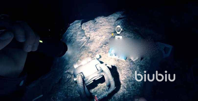 这时往更深的前方继续前进,我们就可以找到路边的潜水器了。这里小伙伴们一定要注意,拿完之后不能原路返回,否则路是走不通的,无法成功出去。要继续向前,从前方的水中游出来,同时要注意水里的鲨鱼。