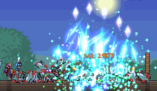 然后就要说到雨,第一种是普通的雨,当玩家在Boss Rush之外召唤Storm Weaver时也会开始下雨。而且在死亡模式中,甚至有一些额外效果,另外一种是酸雨,这其实是一种天气,需要在击败克苏鲁之眼之后,有很小很小的几率出现并开始。