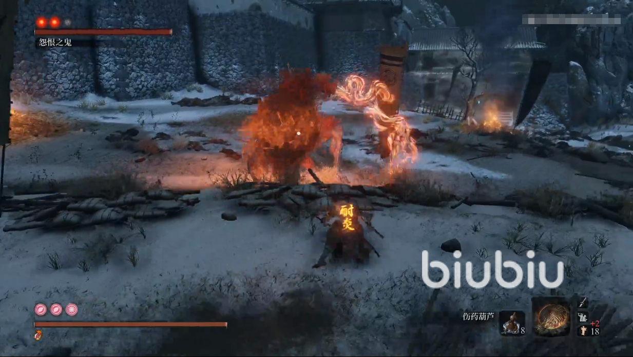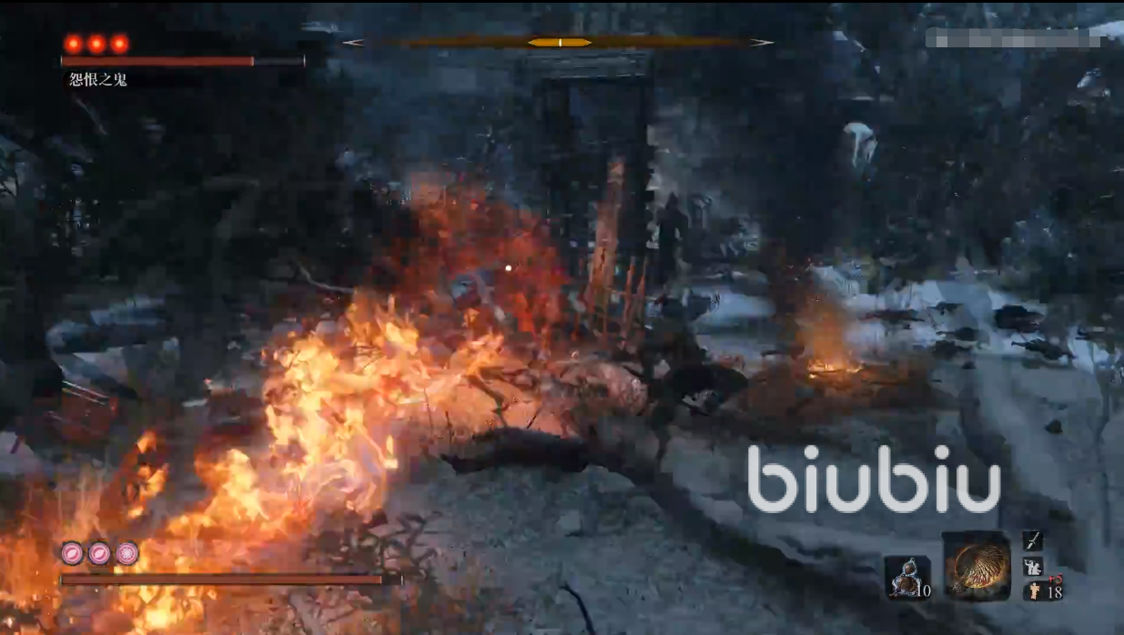 结尾处因为看见幕府军队对苇名的屠杀,按奈不住的怨恨散发出来,成为了怨恨之鬼,打他可以分成3个阶段。1阶段招式比较少,面对对方左手使出火龙直线攻击的时候,玩家可以钩绳跳过去劈砍攻击,包括他跺脚,或者向前推掌都是攻击的好时机,但是万一他出招之后接跳或者龙车,玩家打起来非常痛苦。2阶段增加了招式,有火球以及火龙两个技能,距离非常远,不过前摇长,玩家趁机输出,躲得时候钩绳侧跳躲避。3阶段多了范围攻击,会出现火圈,也是抓住动作前摇时间进攻,不贪刀慢慢磨死没问题。