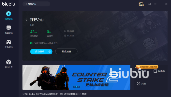 以上这些便是小编为大家整理的关于狂暴之心的加速器的选择和实际的加速情况,目前biubiu加速器为新用户准备了大量福利,其中就包括打折和免费的会员使用,大家如果想体验流畅游玩狂暴之心的话,就请点击上方的下载链接来下载吧。