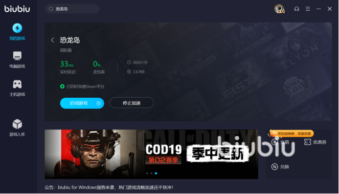 biubiu加速器拥有着目前游戏市场大部分游戏的加速功能,除此以外它为了让玩家体验到最好的加速服务,还提供着大量的国外服务器加速功能和多节点智能选择。万一玩家在加速途中出现网络波动或者障碍,biubiu加速器也会在第一时间智能完成服务器的节点切换,从而保证玩家在游玩恐龙岛的时候不会出现卡顿和掉线。