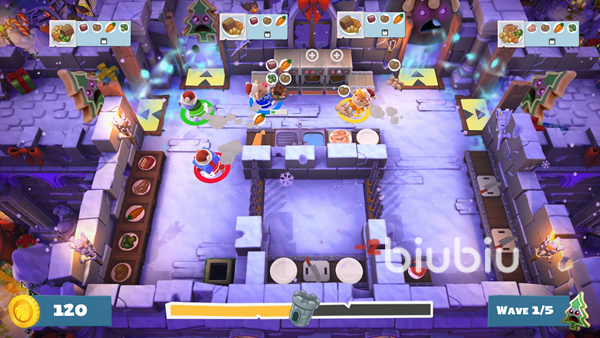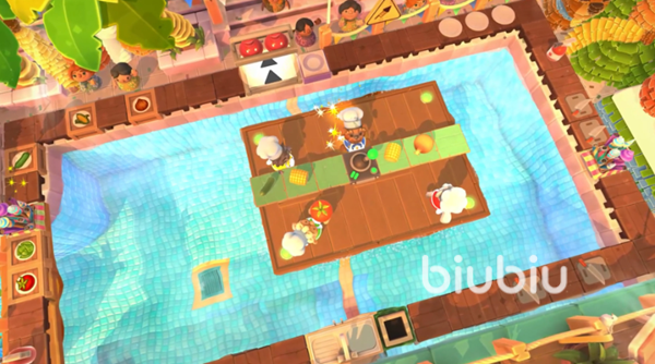 游戏采用的是关卡制模式,大家可以独身一人和AI队友一起合作,或者是叫上小伙伴通过紧密的配合共同完成冒险。在游玩的过程中,大家需要跟随系统给定的食物要求以及对应的菜谱马不停蹄地进行食材的处理、搬运、烹饪和提交。这些单个操作比较简单的步骤连在一起就难免让人感到手忙脚乱了。除了合作闯关模式之外,本作还提供了对战的模式,更是让竞技性变得更强。不管是哪种模式其实都是带有时长的限制,更是要求大家不能浪费一分一秒,所以拥有一个稳定快速网络环境的重要性就不言而喻了。