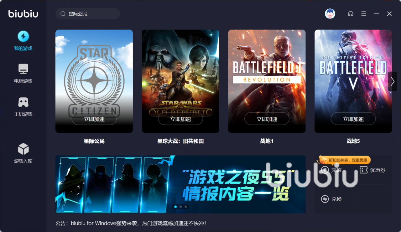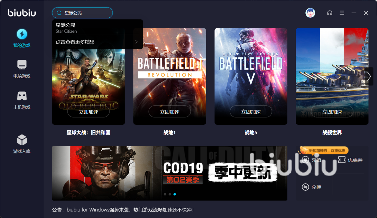 第三,Biubiu加速操作便捷。运行安装包,玩家打开Biubiu,注册与登录用户,通过实名认证等,打开加速,后台直接安装上游戏加速包。等待两三分钟加速完成,星际公民游戏能启动了。此时,游戏不会出现闪退、网络延迟、速度不佳等。