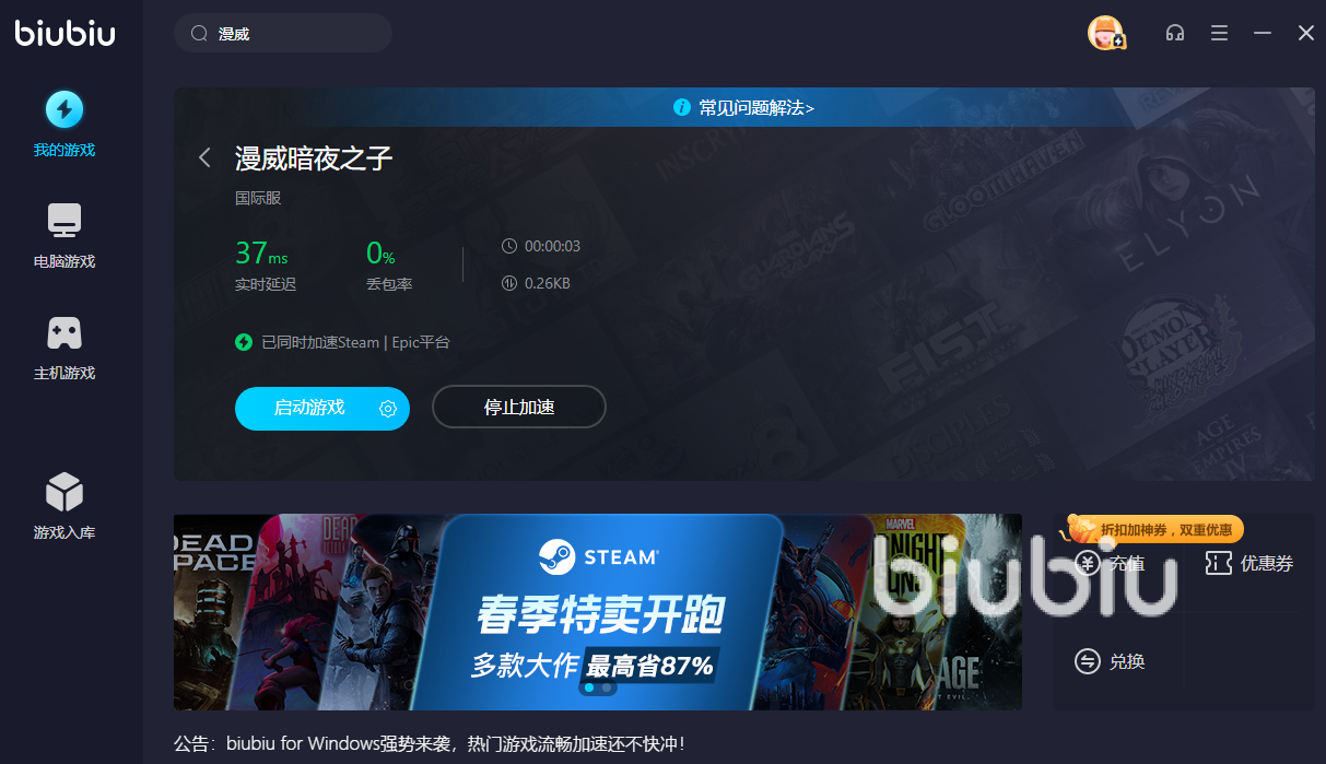 作为一款主打着优秀的打击感以及酷炫的人物建模的游戏,漫威暗夜之子可谓是在这两方面做到了极致,精细到发丝的英雄建模以及爽快的环境破坏以及打击感,将这款扮演式游戏腿上了steam热门游戏的前几名,除了有各位漫威粉丝的助力外,其本身的游戏趣味性当然也不容小觑啦!可是,这款游戏却时常发生画面割裂,闪退等问题,实在是令各位漫威粉丝无语,漫威暗夜之子因为其超高的难度以及较少的存档点吗,一次闪退可能就会造成游戏进度的全部消失,如果真的发生了这样的事,那才叫令人欲哭无泪呢,毕竟谁愿意心惊胆战的玩一款自己喜欢的游戏呢?还好我有biubiu加速器为我的英雄之旅保驾护航。