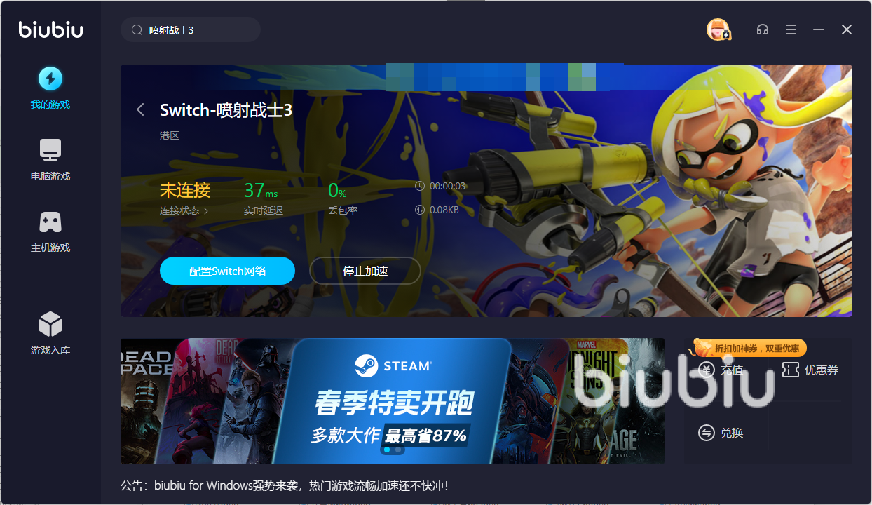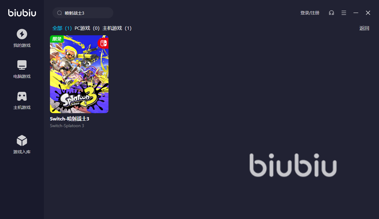 1.首先我们点击文章中链接下载完成biubiu加速器之后,跟着指引步骤注册完成后登录即可。我们现在游戏库中搜索喷射战士3,添加到自己的游戏库即可。
