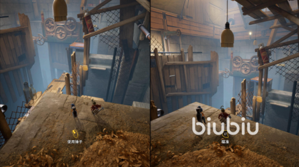 小梅走到旁边有一处铁板的地方,铁板上有个黄色的把手,小梅用锤头击打黄色的一点,这时铁板会翻到另一边,趁着这个空隙利用铁板作跳板跳到对面。科迪跳到对面后转过身,这时小梅再锤下铁板,等铁板翻过来的时候,我们可以发现在科迪的那一处,铁板有一个环形贴着木板,科迪在圆环到达木板处投掷钉子把铁板固定住,之后小梅就可以跳过来了。