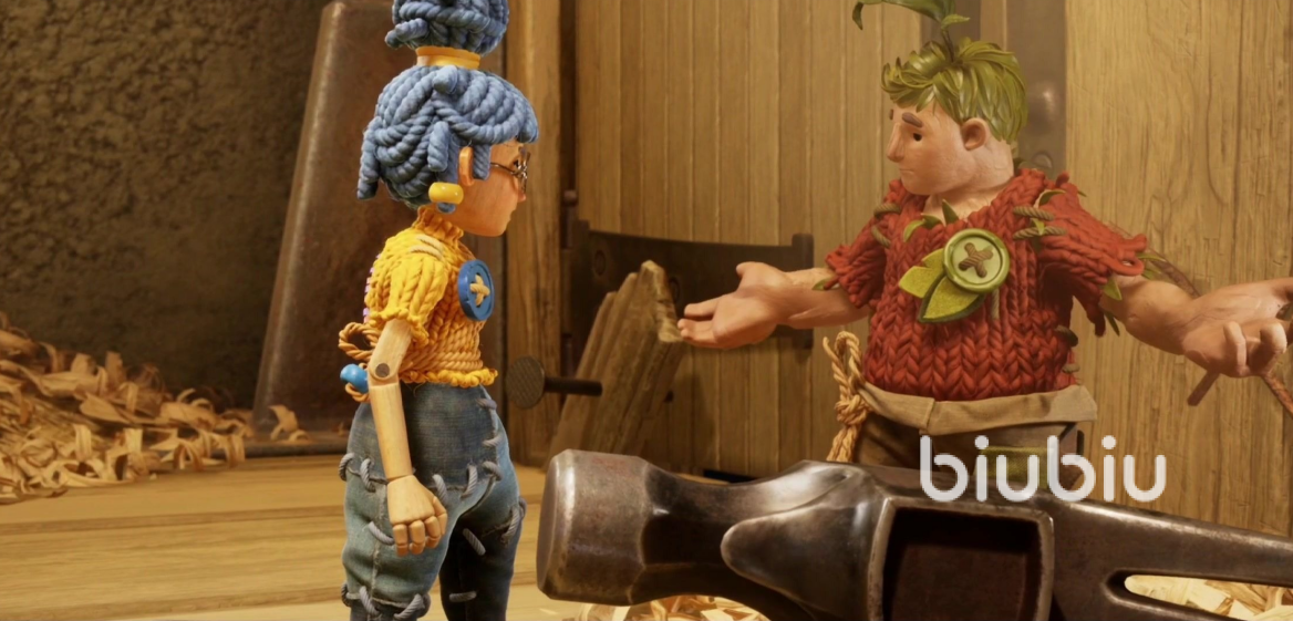 在这个时候他们身后会出现一个会说话的锤子,之后锤子让他们到旁边的门上将钉子取下来,他们就有了一个会说话的锤头和一个会飞的钉子。小梅可以用锤头来锤东西而科迪可以将钉子瞄准地方投掷出去并且可以将钉子再召回来。之后我们从右边跳下去再往前走到木板处,会有一个钢丝分开的两处,这个时候需要小梅走到左边的地方,然后科迪在右边的木头边缘等待。