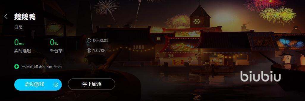 最后就是大家最关心的加速问题了,目前一旦各位开启了针对游戏的网络优化之后,系统就会呈现出一个加速页面,在这里玩家可以了解目前加速的时间和当前的延迟情况。并且,各位如果是玩steam平台的游戏,biubiu加速器也会同时开启针对此平台的网络优化。