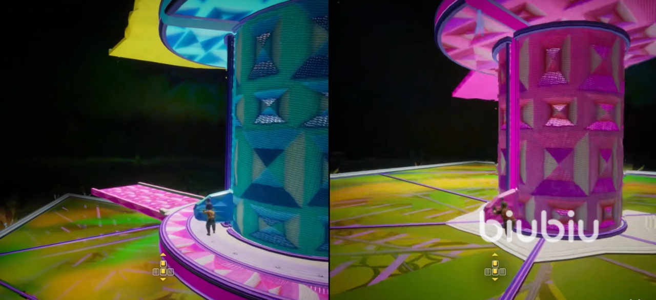 穿过通道,我们会来到一个五颜六色的平台上,玩家脚下踩的地板会出现变化。这个时候,两个人要分别踩住左右两块地板,把固定的几块不一样的地板连起来,连成一条线即可。