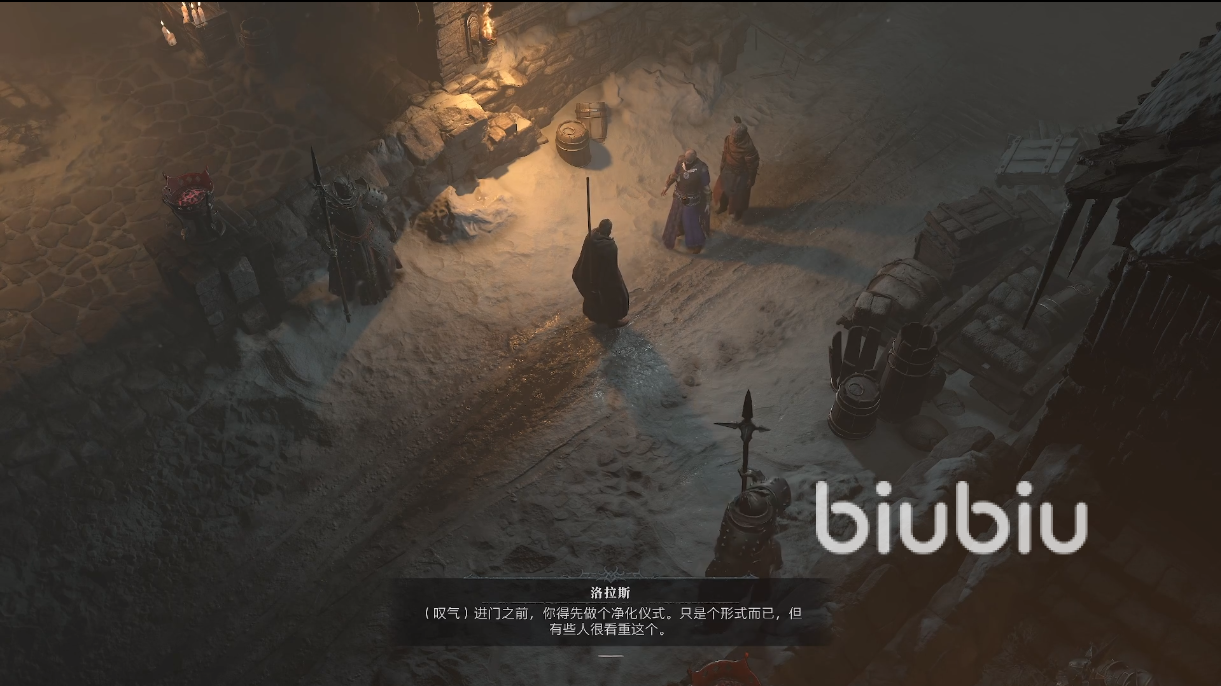 清醒之后就可以遇到隐士洛拉斯,去到北方追魔物,城镇门口士兵要求玩家必须要做净化仪式,这时候需要去旁边的神龛互动,随机选一个词条,做完之后就代表心灵救赎完成了,接下来就可以进入这个城市,在城市里面可以开启后续的游戏环节。