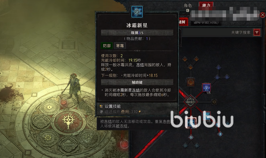 第三层必点的就是传送术,非常重要,冰霜攻击可以冻结周边敌人,很多冰系攻击对于被冻结的敌人都是有伤害加成的,把它的等级点的越高,冷却时间就会越低,频繁冻伤敌人就能让他处于冻结状态很久,对于输出来说是非常有效地控制状态。寒冰甲可以为角色提供一个屏障,吸收基础生命值百分比的伤害,角色造成的伤害也可以转移添加到这个屏障当中,也是个非常好用的保命技能,它的发展也分两个分支,玩家可以选择加强防御,或者是点另外一种微光寒冰甲激活后,受攻击时有概率冻结敌人3秒。