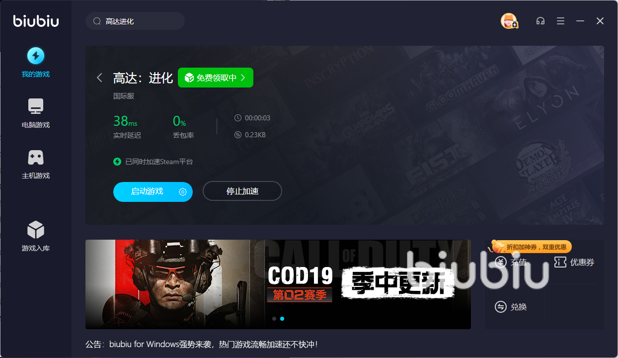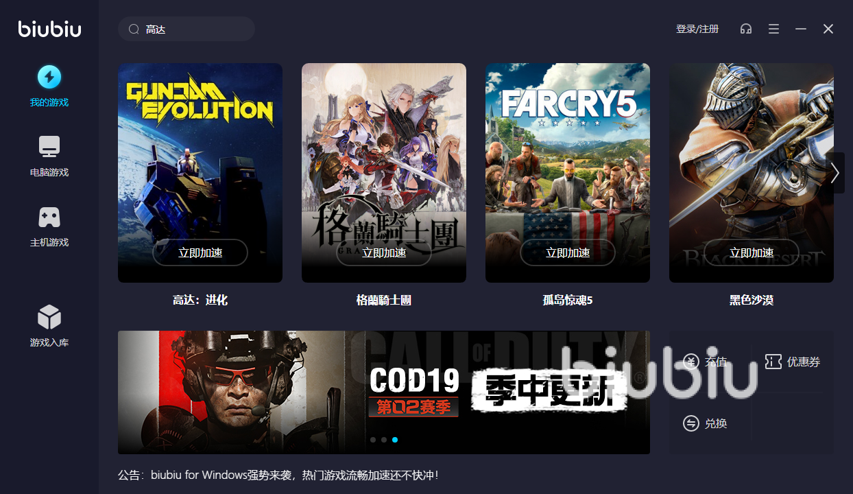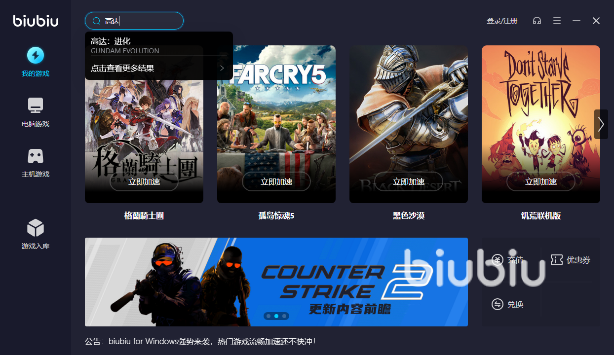 下载软件。在官方网站上,玩家能安装不同端口的biubiu加速器。针对高达进化端游,大家安装好biubiu端游版本,然后运行程序。