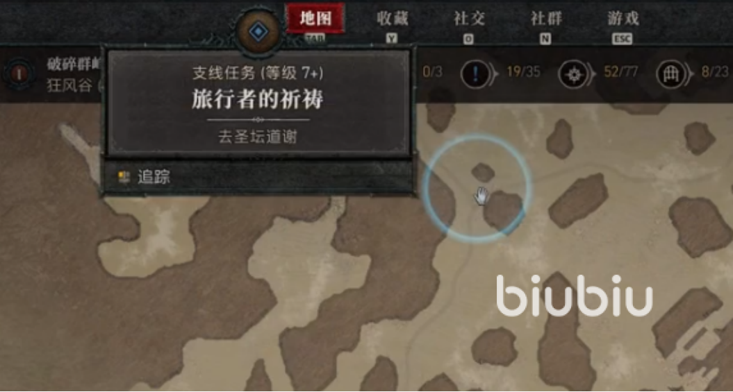 1.请动动亲爱的小手打开地图,点击地图的右上角,看到蓝色圈圈,走到蓝圈圈打开任务点,到达祈祷小房子前,看一下下面图片,可以任务追踪的。
