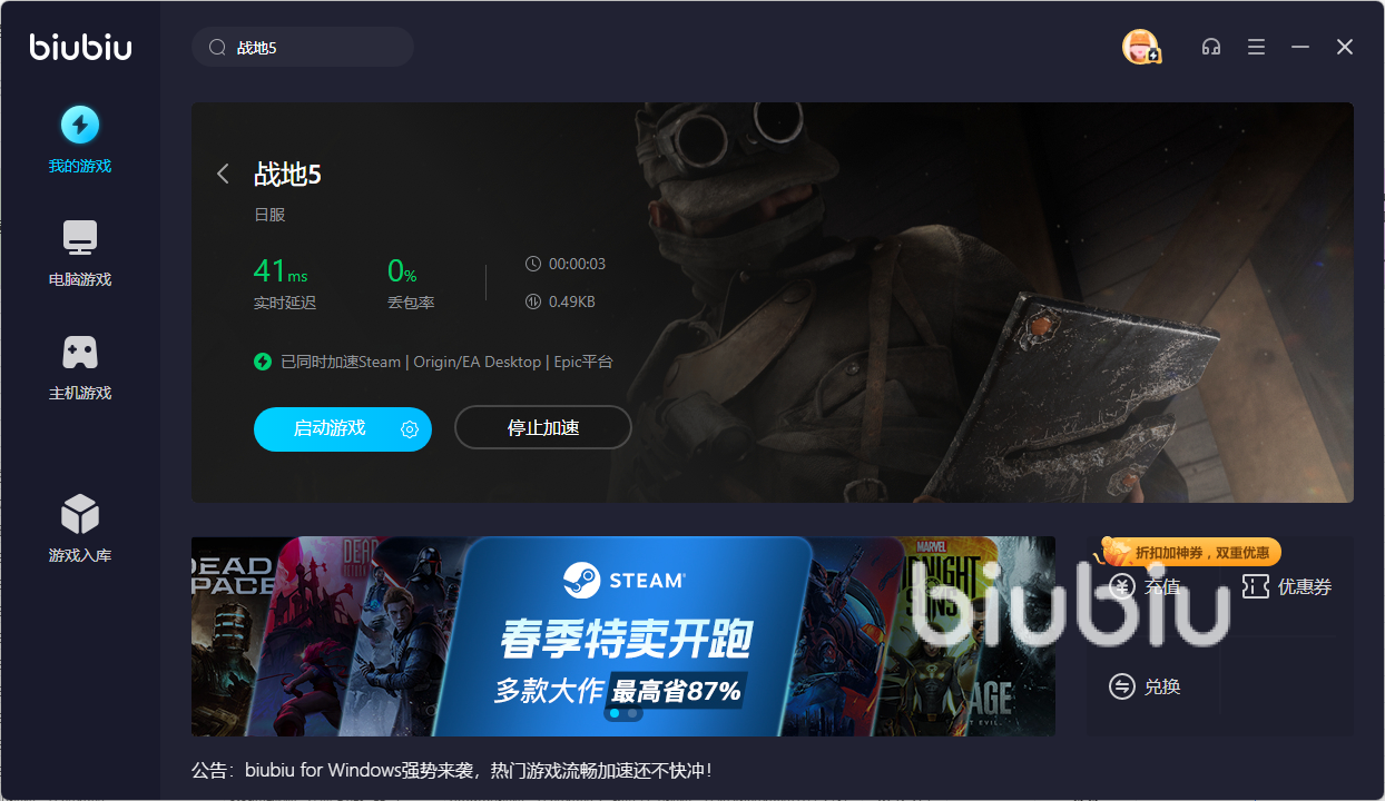 今天发布了战地5加速器路径设置攻略,战地5整个战争场面真实,比同类游戏武器更真实、强大。它拥有重型坦克和侦察飞机、轰炸机等大型载具,带来鲜血般真实战场。在biubiu保驾护航之下,游戏容易掉线、服务器响应速度慢、进程加载卡顿等问题迎刃而解,玩家们无须担心。