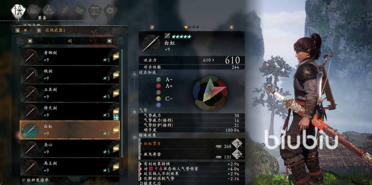 再来讲一讲直剑系,青铜剑具有飞流云和疾电奔雷的特殊效果,也只有这一把剑附带两个c属性。还有值得一提的白虹,这是角色孙权身上的佩剑,他的攻击力和整体性能也非常不错,值得玩家们入手。使用后可对处于中毒状态的敌人进行气势增伤,并延长其不利效果,同时化解消耗气势。
