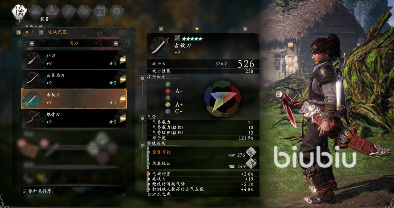 古锭刀是弯刀系中的扛把子,使用它可对敌人造成一定的近战伤害和毒攻力,打败时获得的士气也会有相应的加点。朴刀,西羌马刀以及魃骨刀等级较低,比较普通和常见。青龙偃月刀是人物关二爷的佩刀,使用时自身可获得一定加成的真气,绝脉成功时还可消解自身的不利效果,是一把五星级装备。