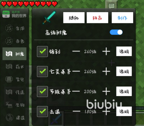 另外该作还有一个附魔系统,玩家可以去探索各地寻找附魔书,或者通过钓鱼意外获得,在工作台进行制作也可以得到,使用之后可以为自己的武器添加额外效果,比如最常见的例如附加火属性,配合单手剑玩法就可以立刻成就自己的“烈火刀法”,在战斗中通过火焰点燃对手造成持续伤害,而弓类玩家可能会喜欢附加无限之类的效果,让自己的普通攻击不会再消耗箭矢,可以一直通过远程与对手做拉扯。